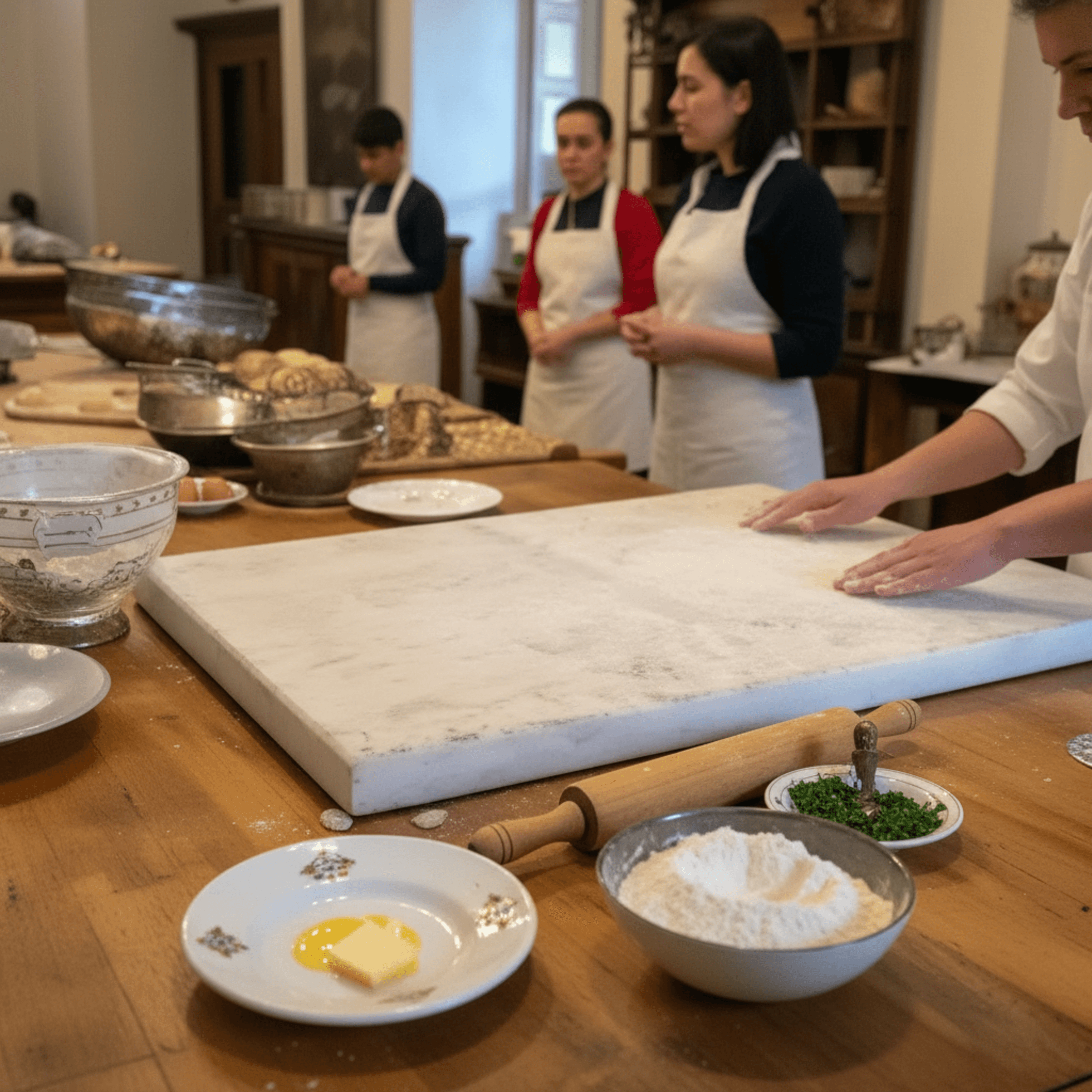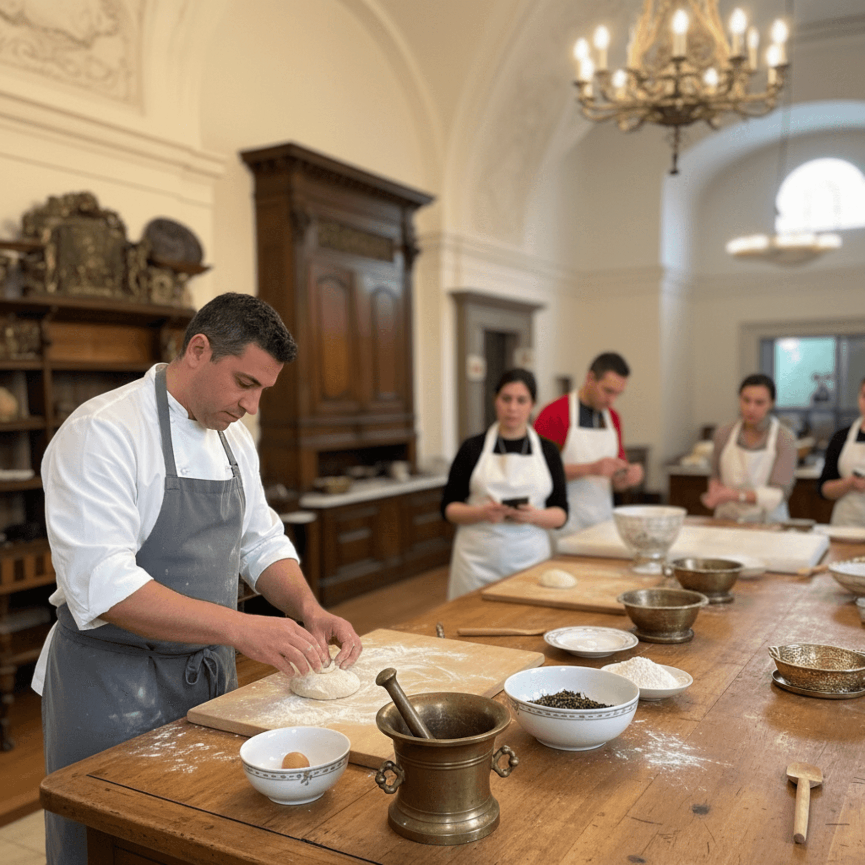 Guests are welcomed by selected chefs and guided step by step in the preparation of local and themed recipes, using fresh, seasonal ingredients sourced from historic gardens or local producers.